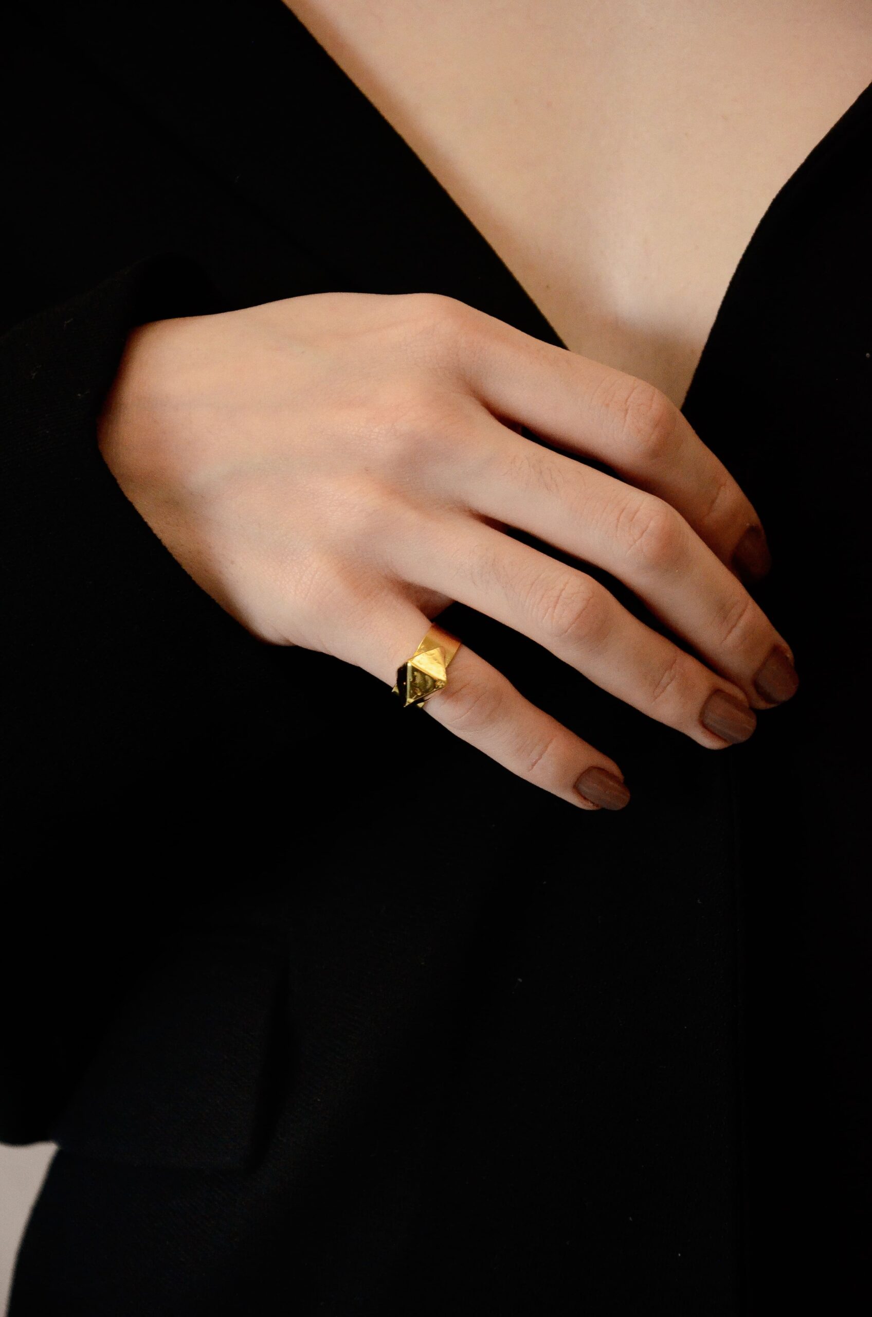 O acabamento em banho de Ouro, aliado ao design autoral confere ao anel uma estética sofisticada e marcante. Além disso, por ser níquel free, é seguro para peles sensíveis e garante conforto no uso prolongado.