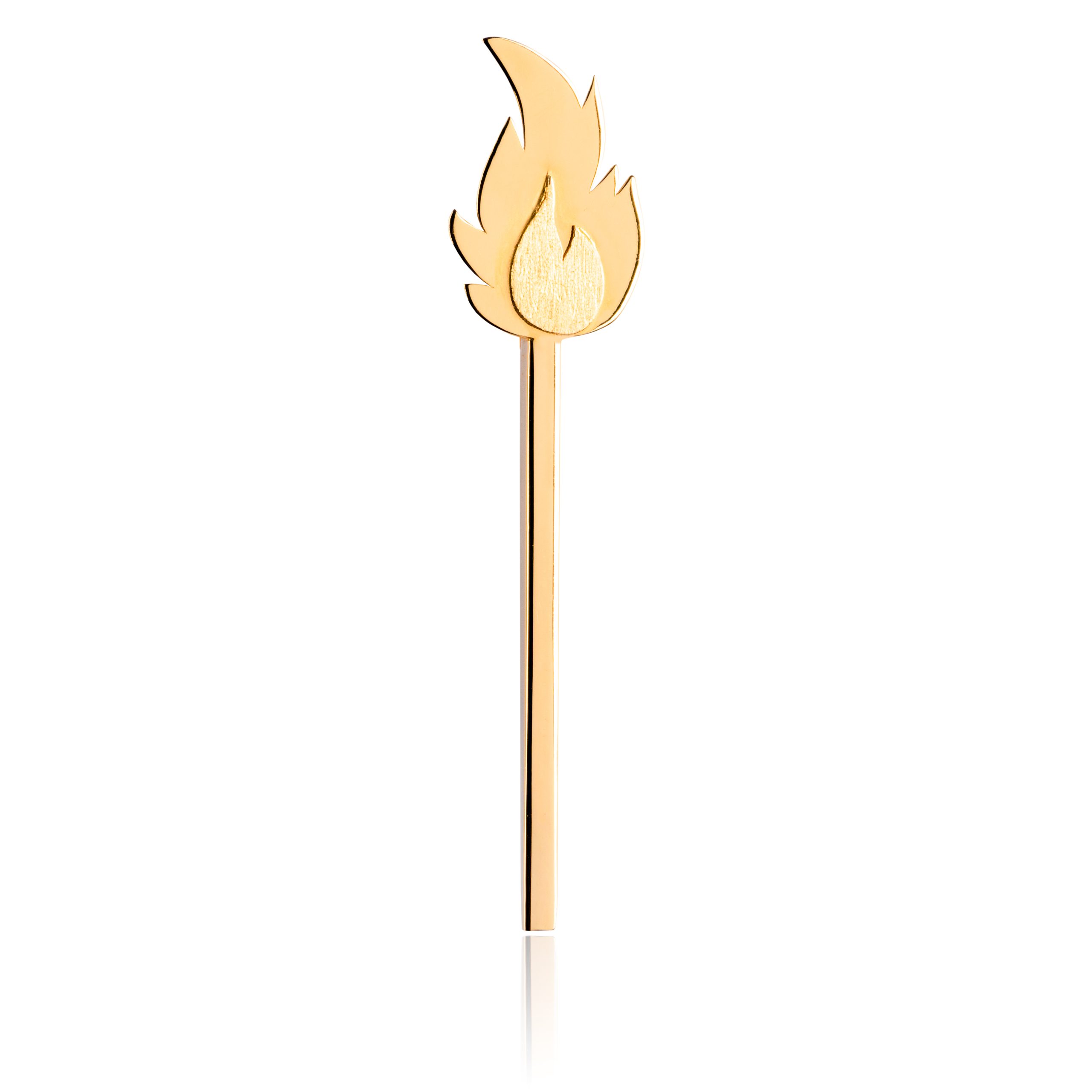 Brinco em ouro 18k com as formas de um palito de fósforo aceso. Corpo da peça retangular em ouro brilho e ponta em formato de chama, com uma chapa de ouro brilho, e uma chapa de ouro fosca sobreposta. Essa peça é vendida a unidade, para que cada cliente possa criar sua própria composição. Fica lindo combinado ao brinco Chama ou brinco Fósforo.