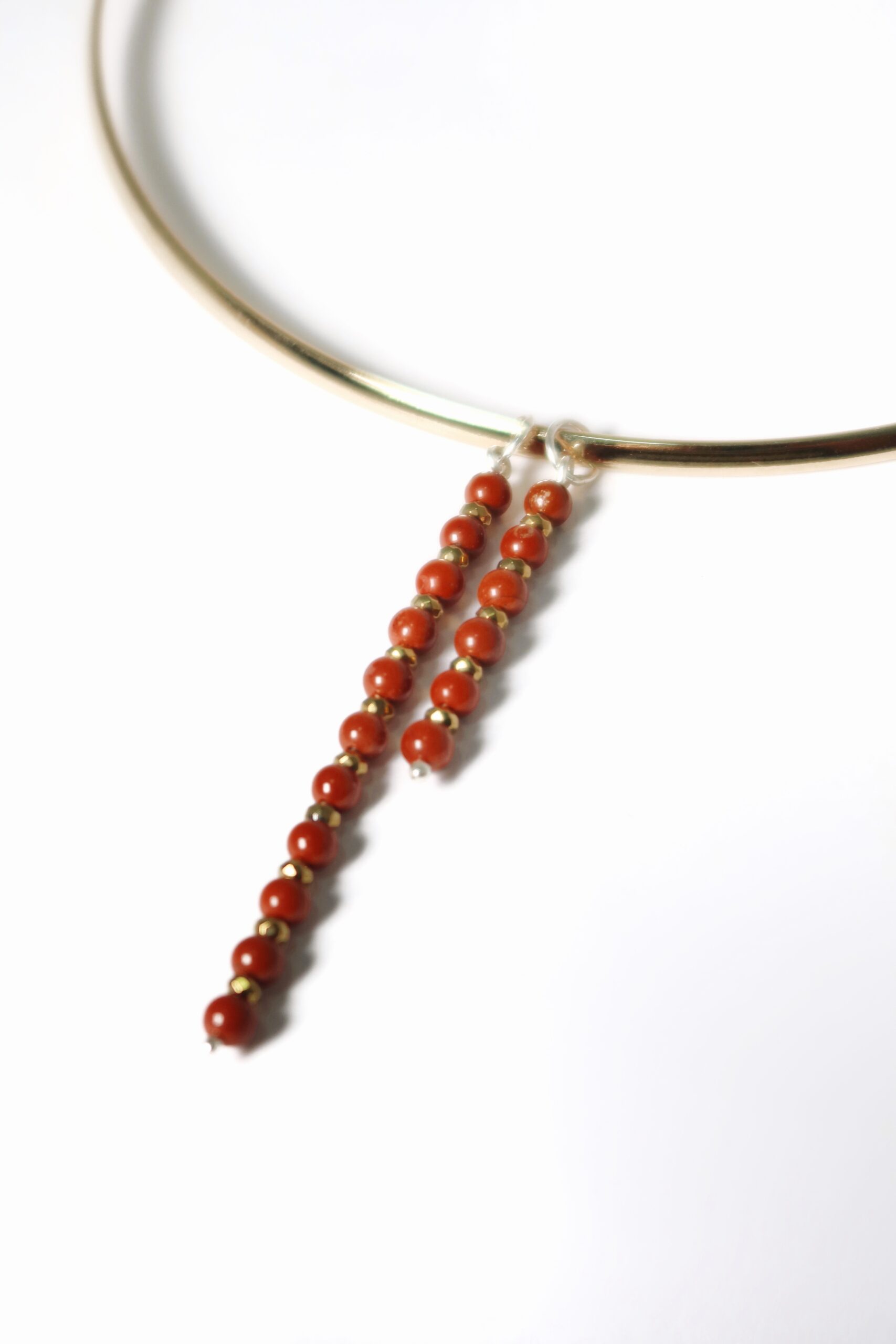 O pingente curto MB Jaspe Vermelho é vibrante e cheio de energia e destaca o Jaspe Vermelho, pedra de vitalidade, ação e força interna, na atmosfera quente da Menina Baiana.